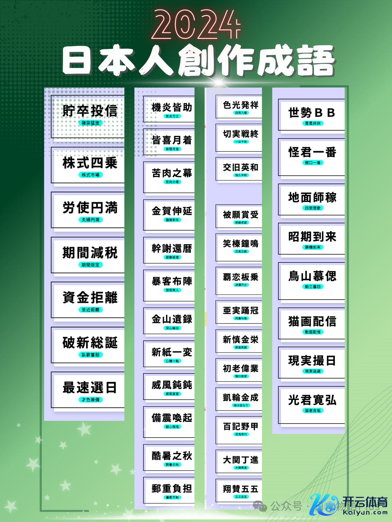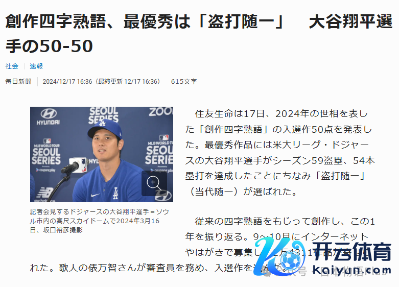 住友生命保障公司于17日公布了2024年度的“创作四字熟语”评比效果,共有50件作品入选。其中,荣获最优秀作品的“盗打随一”(现代随一)灵感开端于好意思国职棒大定约洛杉矶谈奇队球员大谷翔平,他在本赛季完成了59次盗垒和54次本垒打的惊东谈主配置。这些创作四字熟语通过改编传统熟语往复首昔日一年的社会热门话题。这次算作于9月至10月间通过收集和明信片搜集,共收到24311件投稿。评审由着名歌东谈主俵万智担任,她从中选出了获奖作品。优秀作品聚焦社会热门,包括响应大米握续缺少问题的“店店枯米”(天手古舞),姿色石川县能登半岛地震和暴雨影响的“震劳浸苦”(繁难艰辛),展现日本银行取消负利率策略的“利子复活”(起死复活),以及用汉字抒发特朗普和总统选战相持的“虎针眈眈”(虎视眈眈)等共9件。以下是2024年创作四字熟语的获奖名单:最优秀作品盗打随一(现代随一)优秀作品(9件)利子复活(起死复活):响应经济策略变化群雄割齐(群雄割拠):刻画竞争热烈店店枯米(天手古舞):挖苦大米缺少窘态退职(无芸大食):隐喻无声的下野潮震劳浸苦(繁难艰辛):发扬灾后重建的艰辛暗罪对策(罪人对策):聚焦社会顺次问题虎针眈眈(虎视眈眈):刻画好意思国总统选战的短兵不绝骑士奋迅(狮子奋迅):发扬个东谈主远程的奋发精神将真赏米(正确凿銘):抒发对确凿价值的追求入选作品(40件体育游戏app平台,节选)储卒投信(猪突大进):标志前仆后继破新总诞(卧薪尝胆):体现果决拼搏新纸一变(神思一溜):清晰面庞一新邮重职守(柔滑胁制):揭示邮政行业职守加剧被愿赏受(悲愿配置):传达心愿结束的抖擞初大哥业(诸行无常):诙谐姿色老龄化社会大地师稼(旬日并出):挖苦诓骗横行等。这些作品以酷好又厉害的神色追想了一年的社会热门,值得细细品尝。大略古代的谚语亦然这么出现的吧。