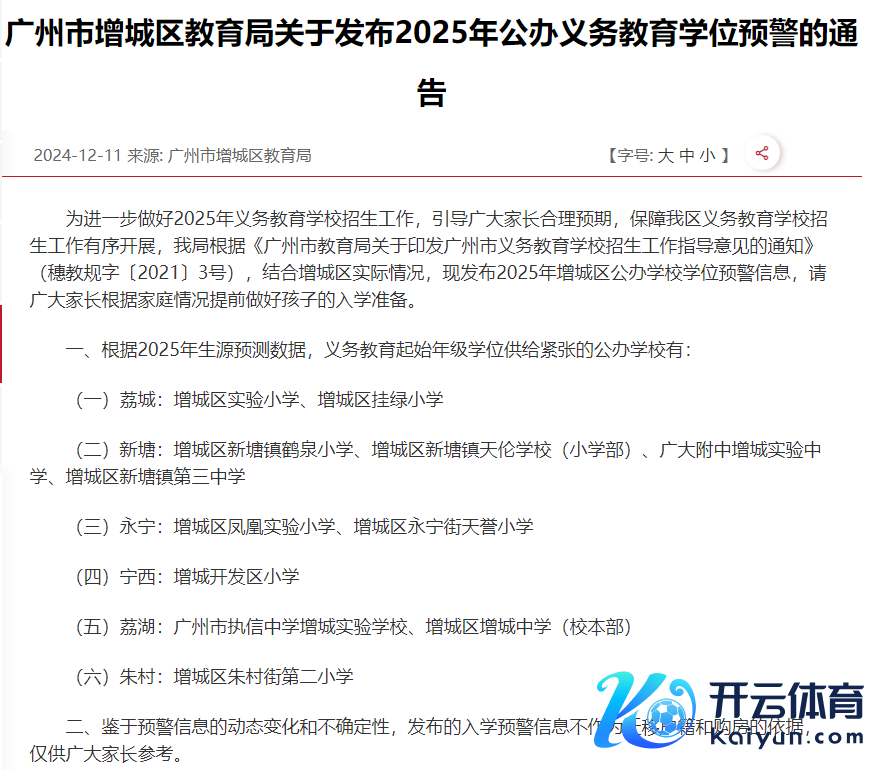 近日,广州市增城区教育局发布了《对于发布2025年公办义务教育学位预警的告示》。