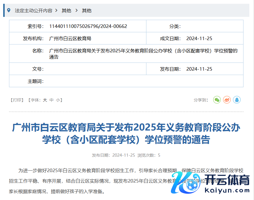 近日,广州市白云区教育局官网发布了《2025年义务教育阶段公办学校(含小区配套学校)学位预警的告示》。