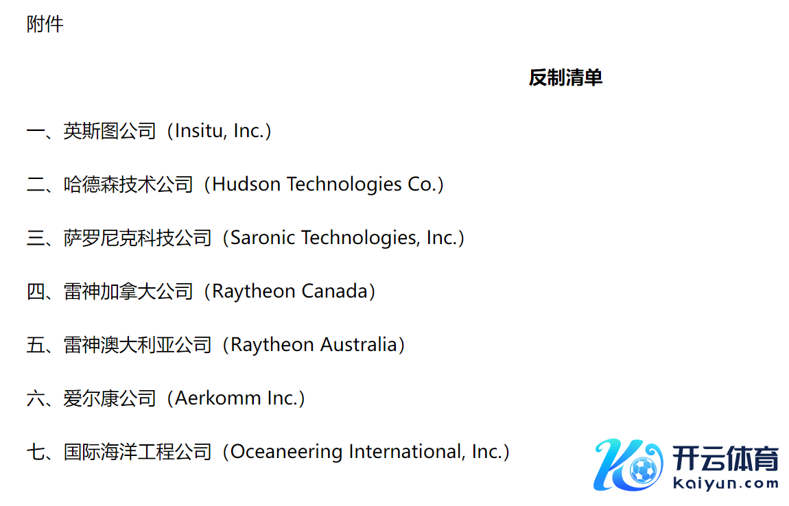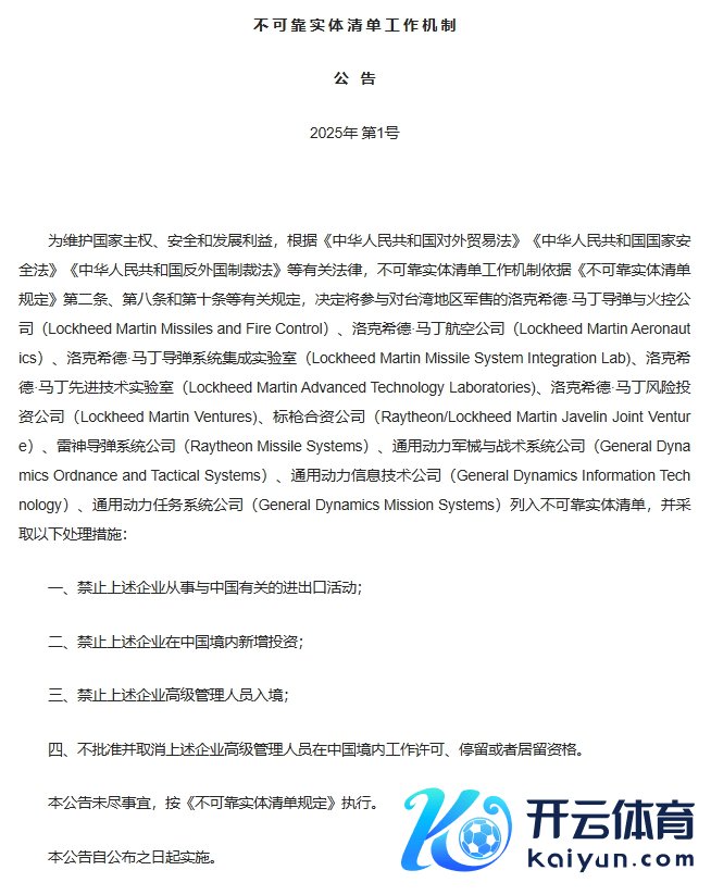 商务部公告云开体育,决定将参与对台湾地区军售的海岸间电子公司(Inter-Coastal Electronics)、系统斟酌与模拟公司(System Studies & Simulation)、铁山料理决议公司 (IronMountain Solutions)、哄骗期间集团(Applied Technologies Group)、阿克西恩特公司(Axient)、安杜里尔公司(Anduril Industries)、海上战略系统公司(Maritime Tactical Systems)列入弗成靠实体清单,并领受以下处理法子:一、不容上述企业从事与中国规划的出进口当作;二、不容上述企业在中国境内新增投资;三、不容上述企业高档料理东谈主员入境;四、不批准并取消上述企业高档料理东谈主员在中国境内责任许可、停留大致居留经验。
