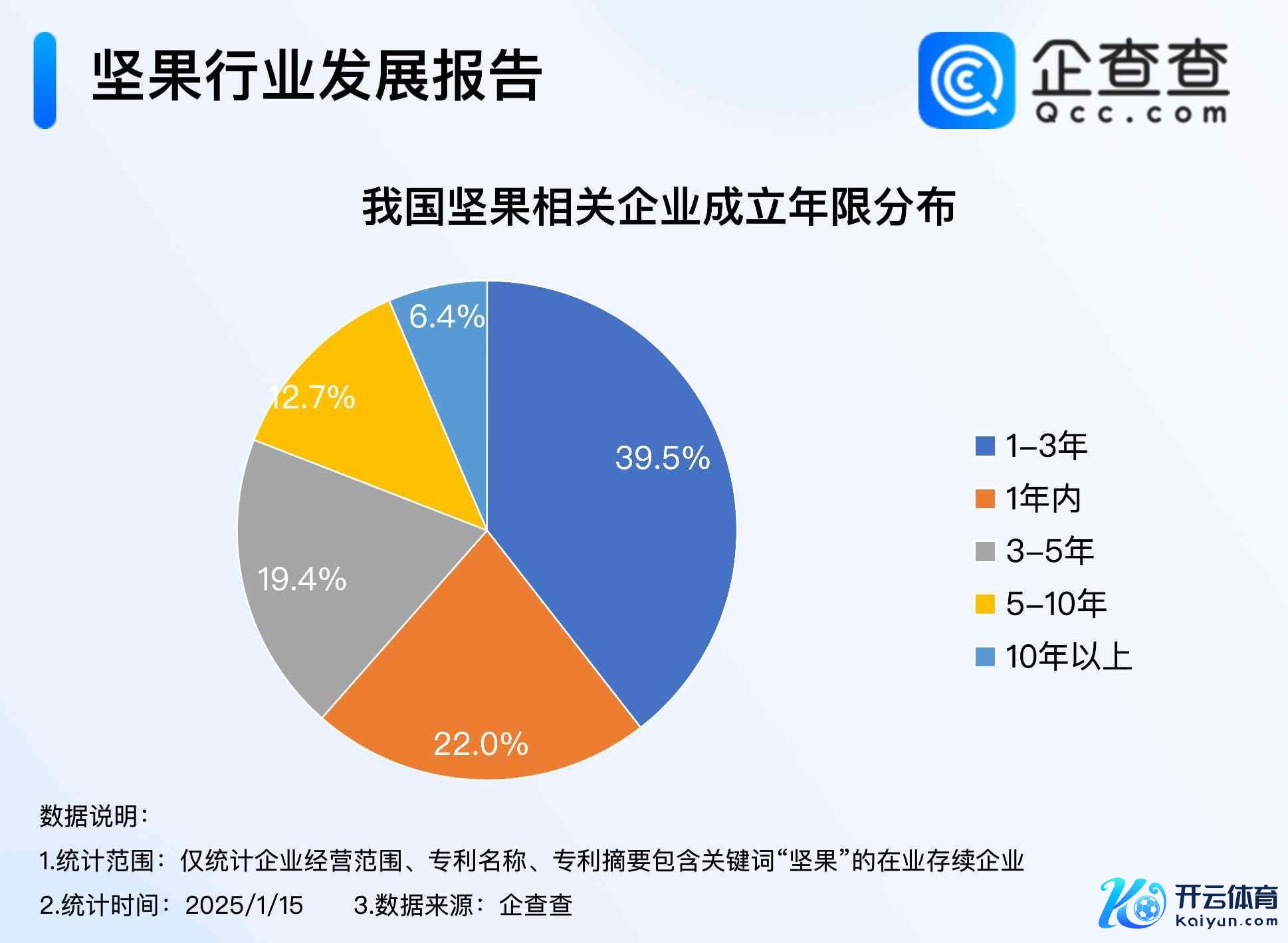 企查查数据显现,确立年限上,我国超六成坚果关联现有企业确立于3年内,其中确立于1-3年的企业最多,占比39.5%,确立于1年内的企业占比22.0%;确立10年以上的坚果关联企业最少,占比6.4%。