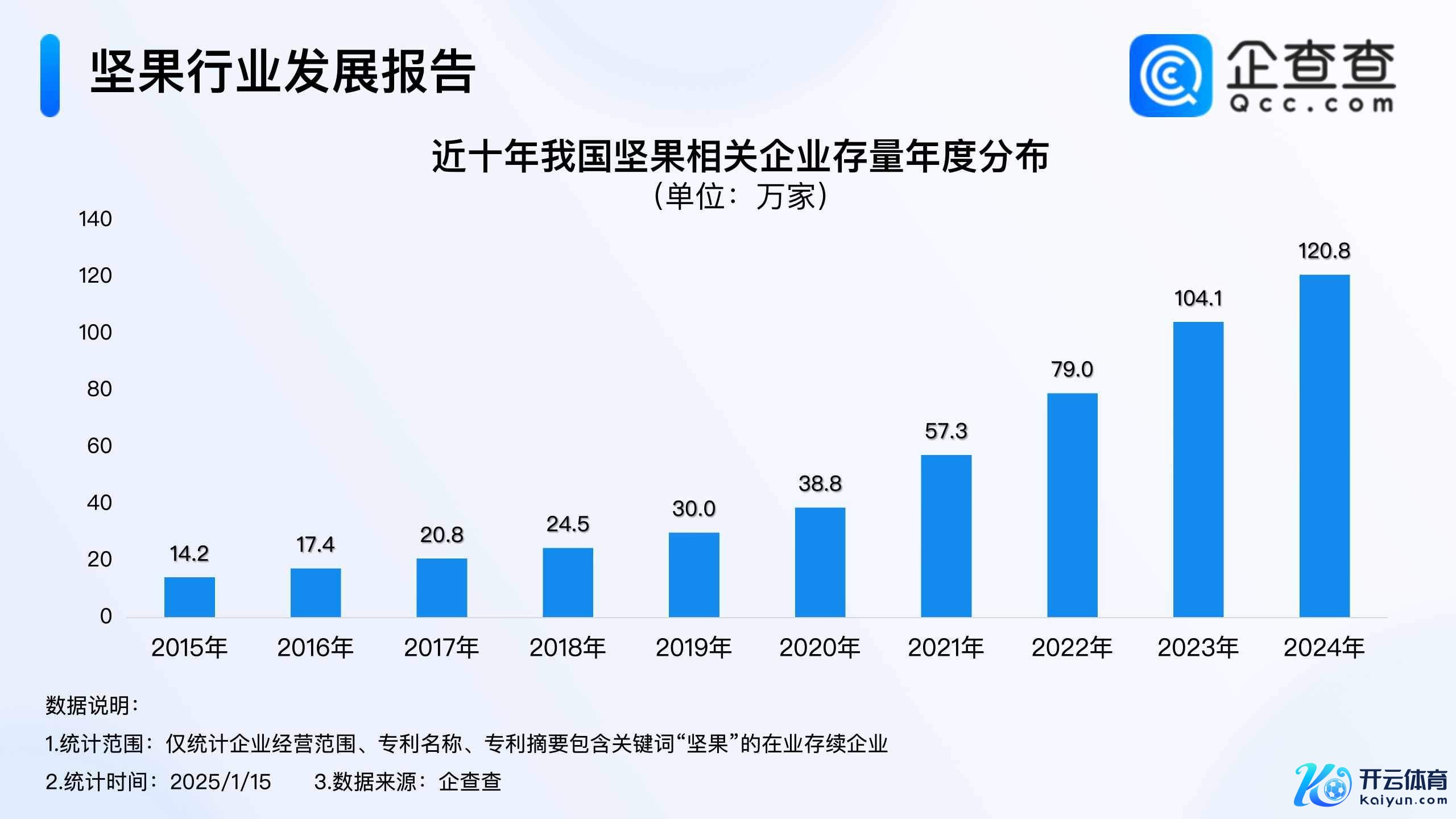 企查查数据显现,近十年,我国坚果关联企业存量逐年增多,并于2023年末初次冲破100万家,达104.1万家,2024年末达120.8万家。适度2025年1月15日,我国在业存续121.5万家坚果关联企业。
